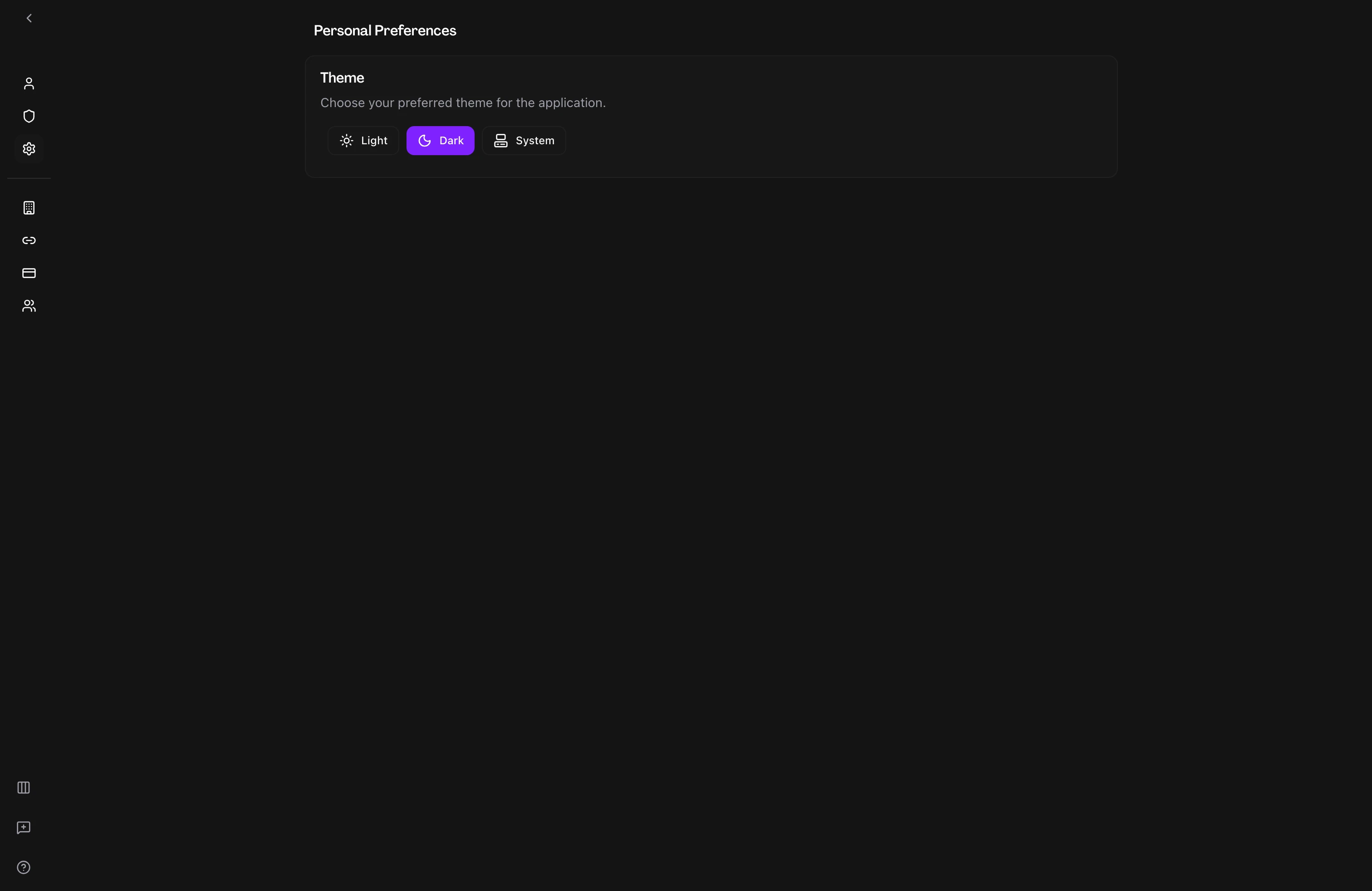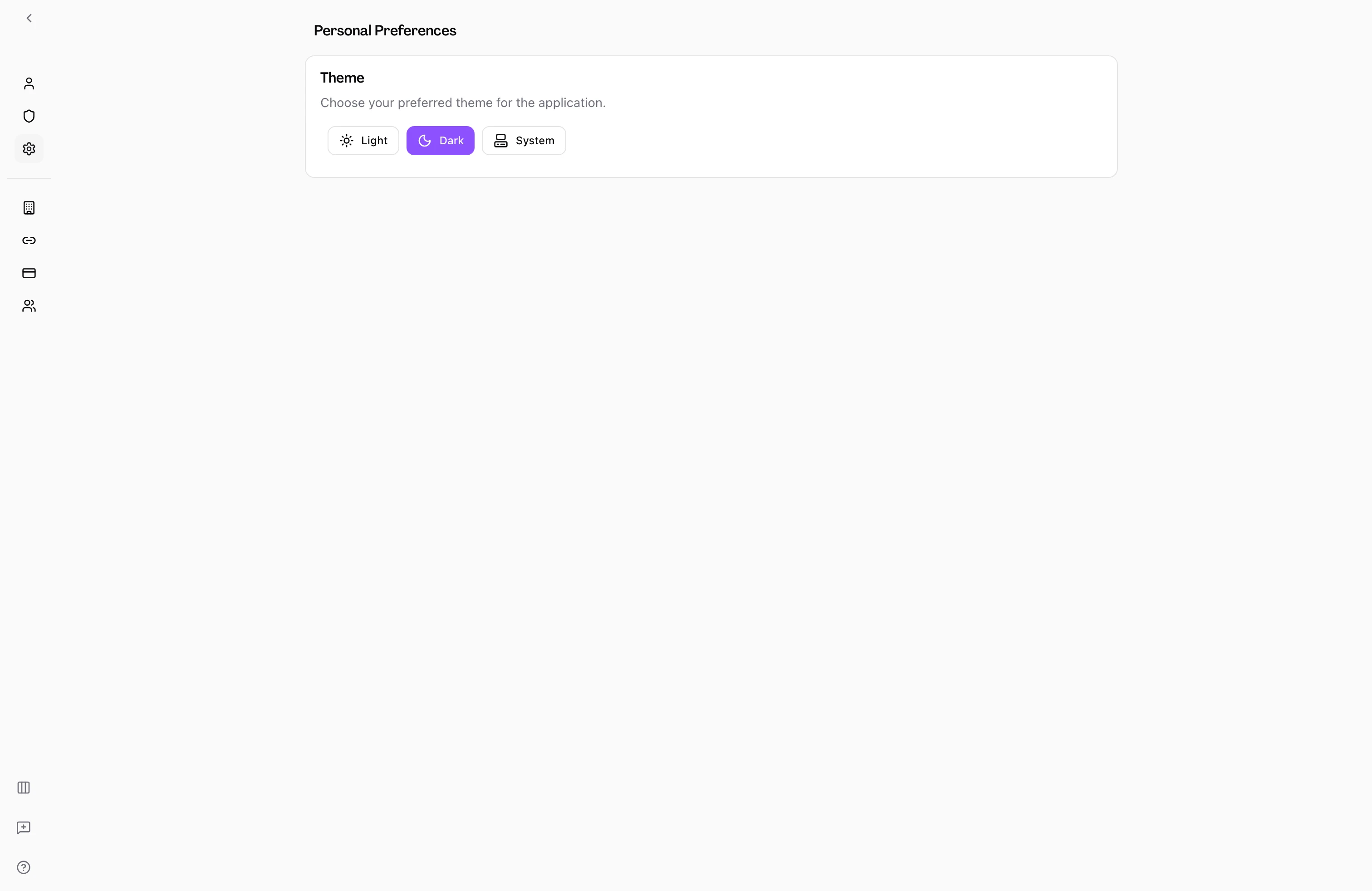 Choose a theme — The Theme section presents three options: Light, Dark, and System. Click the button for the theme you want to use. The change applies immediately — there is no save button.