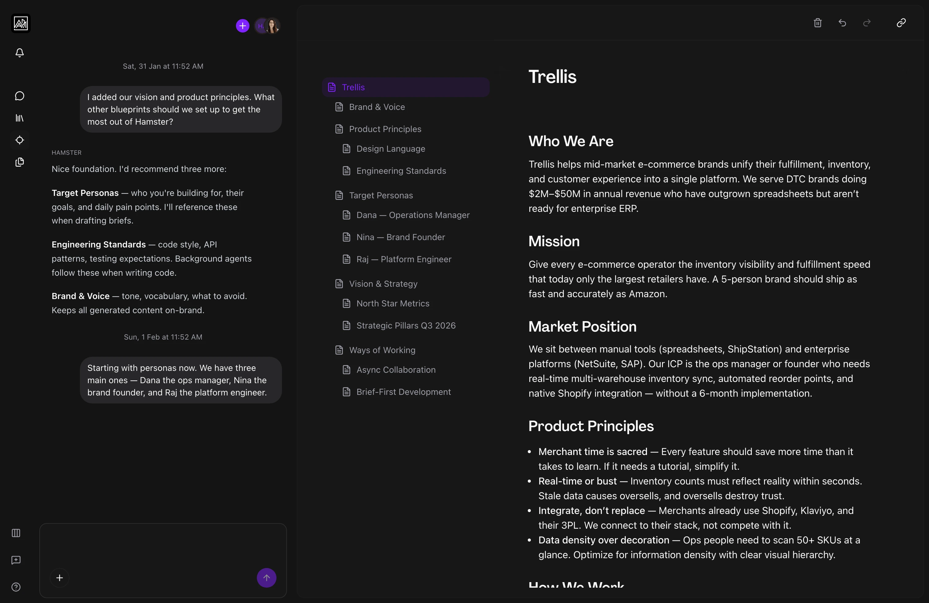 A blueprint is a document your whole team shares. It can cover anything that grounds your work — product vision, target personas, strategic goals, brand voice, or team norms. You start with a single root document and grow it into as many child documents as you need. Each document you add becomes part of the same connected tree, and all of it feeds into the AI's understanding of your organization.