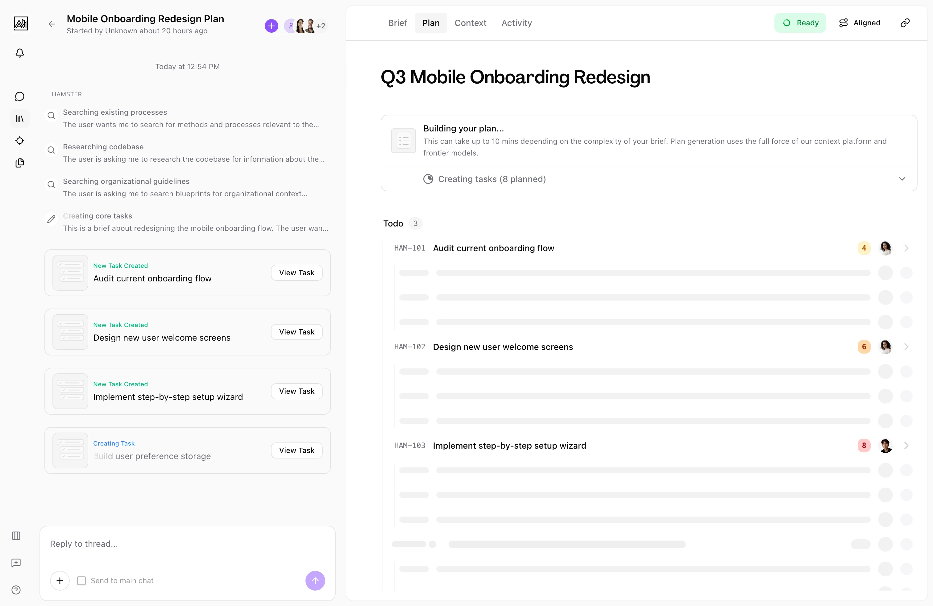 Context-aware generation: Before creating tasks, Hamster searches your blueprints, methods, connected tools (including Figma designs if connected), and your codebase. The plan reflects your team's actual patterns and existing work, not a generic breakdown.