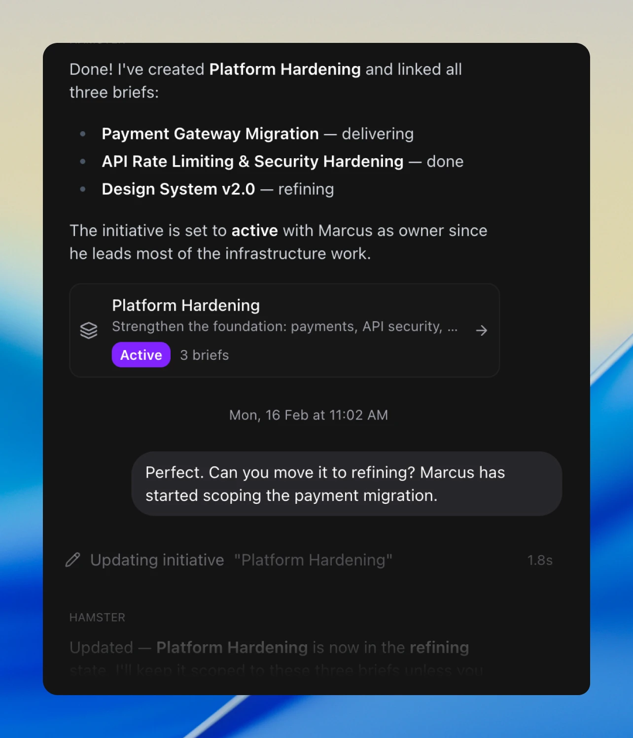 Hamster can now create initiatives, link briefs, reorder priorities, and check what's in flight directly from chat.