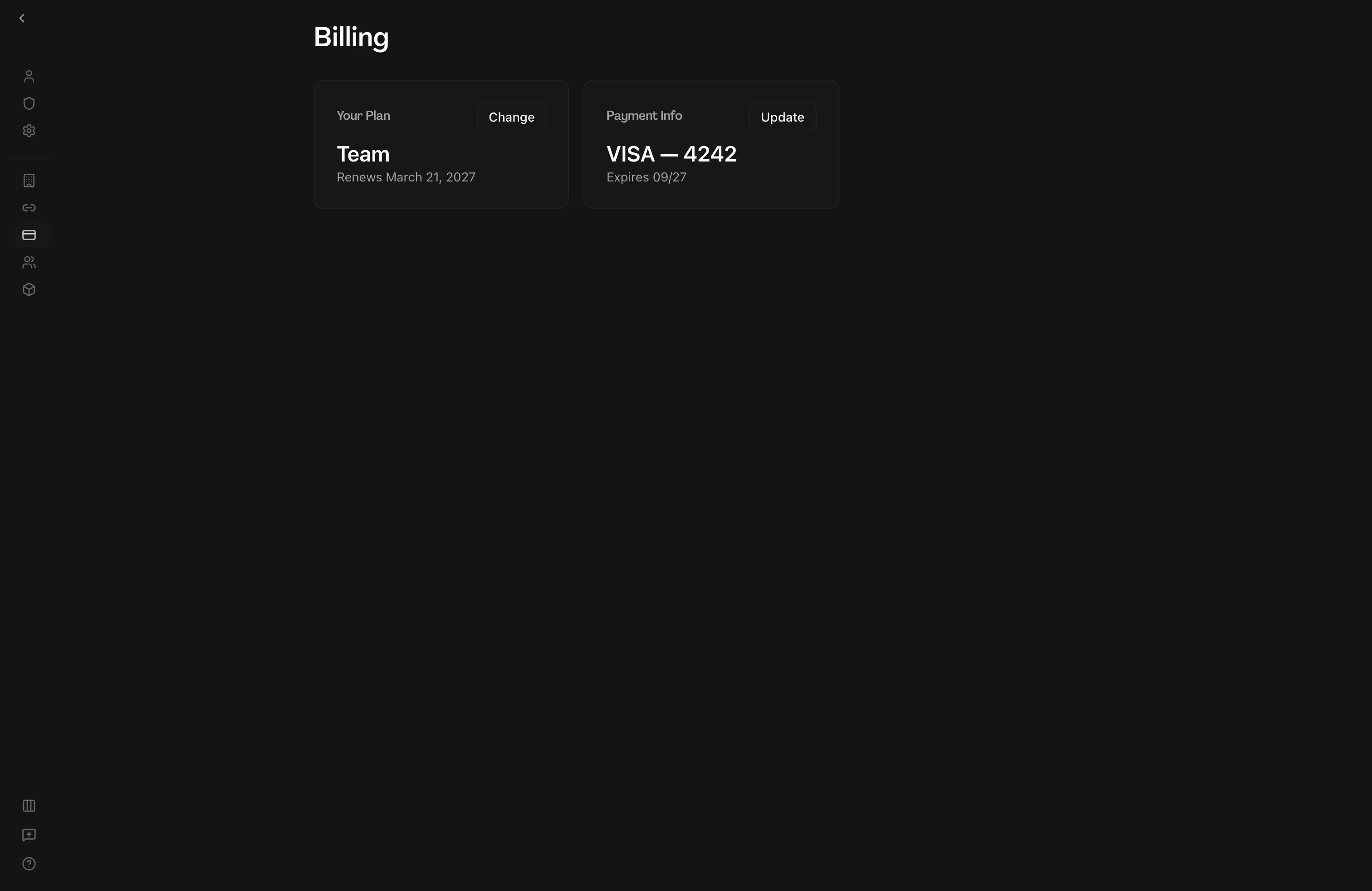 View your team's current plan, change your subscription, and manage payment details.