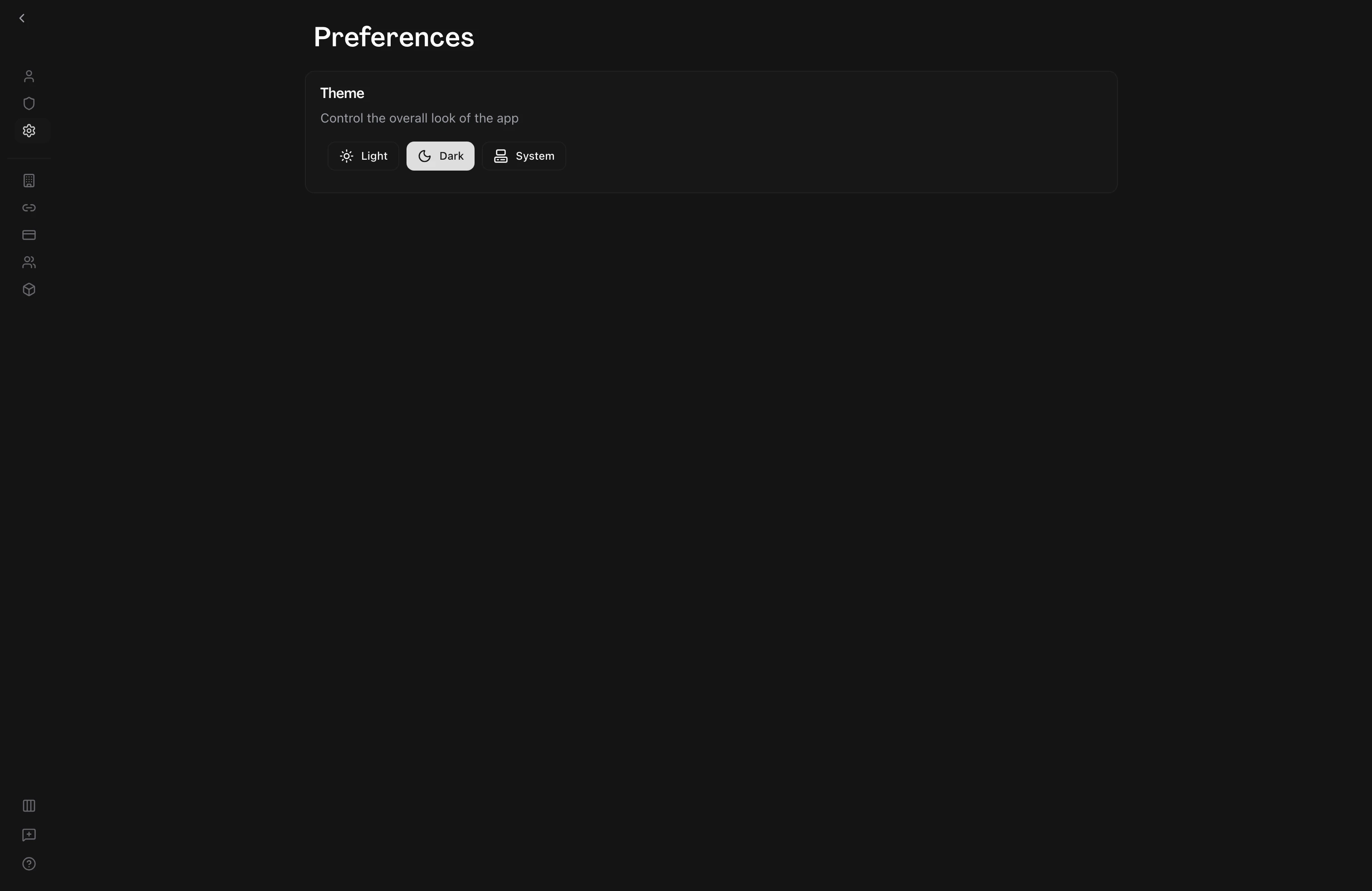 Choose a theme — The Theme section presents three options: Light, Dark, and System. Click the button for the theme you want to use. The change applies immediately — there is no save button.