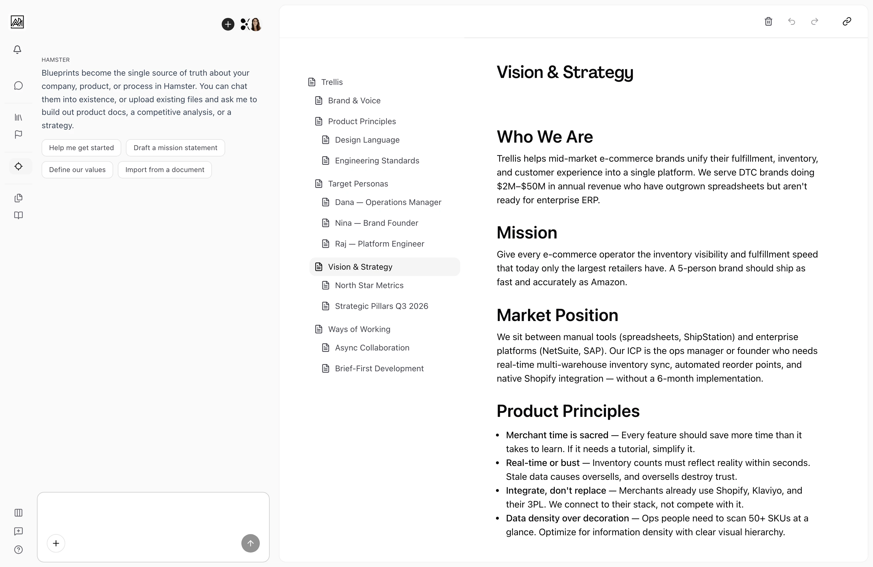 Flat top-level documents: One document per major topic (Vision, Strategy, Personas, Voice & Tone). Works well when topics are relatively independent.