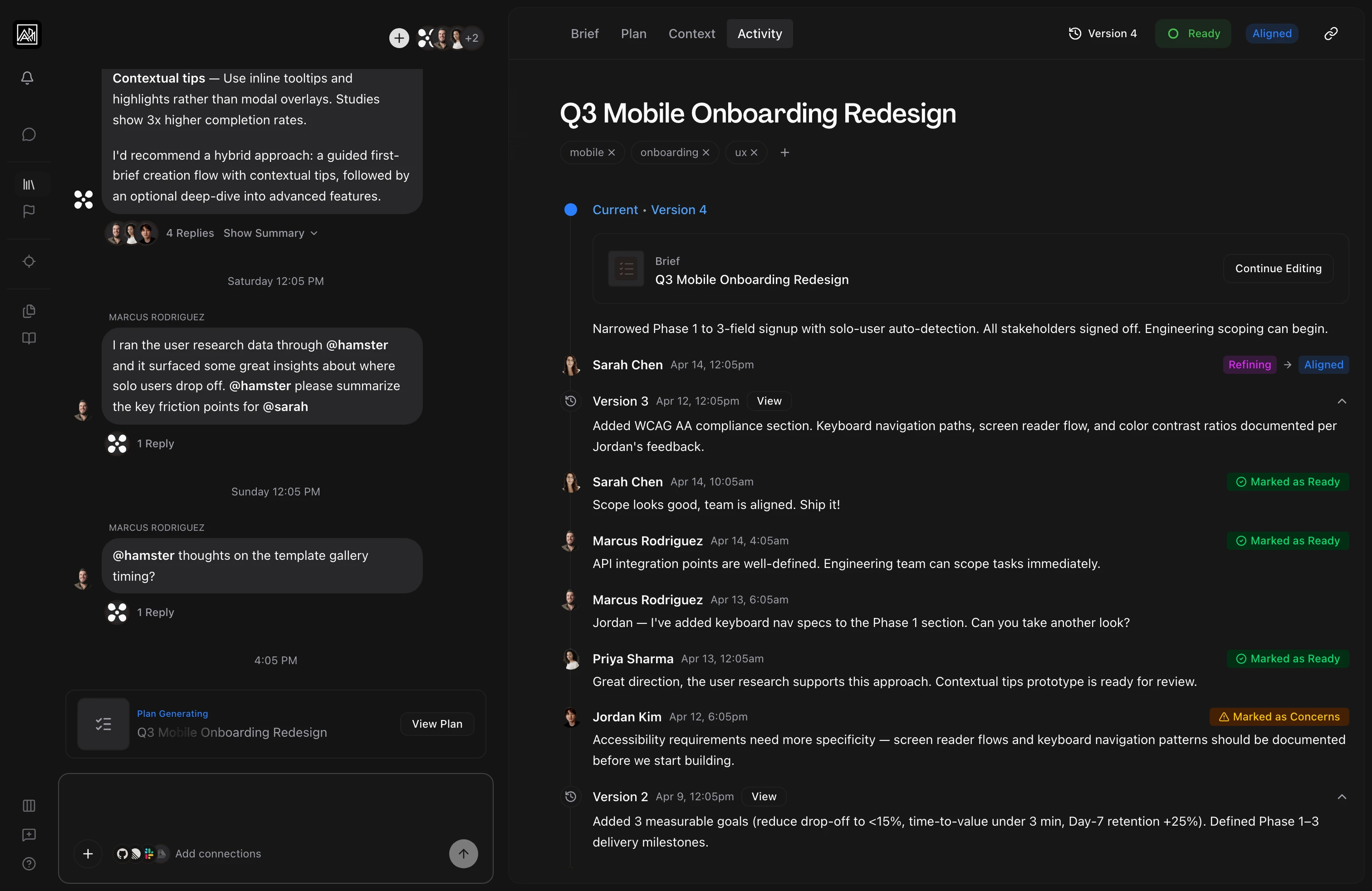 Mention team members and the AI assistant: The @mention picker includes all team members plus the Hamster AI assistant. Direct a question or task at the AI the same way you would a human teammate.