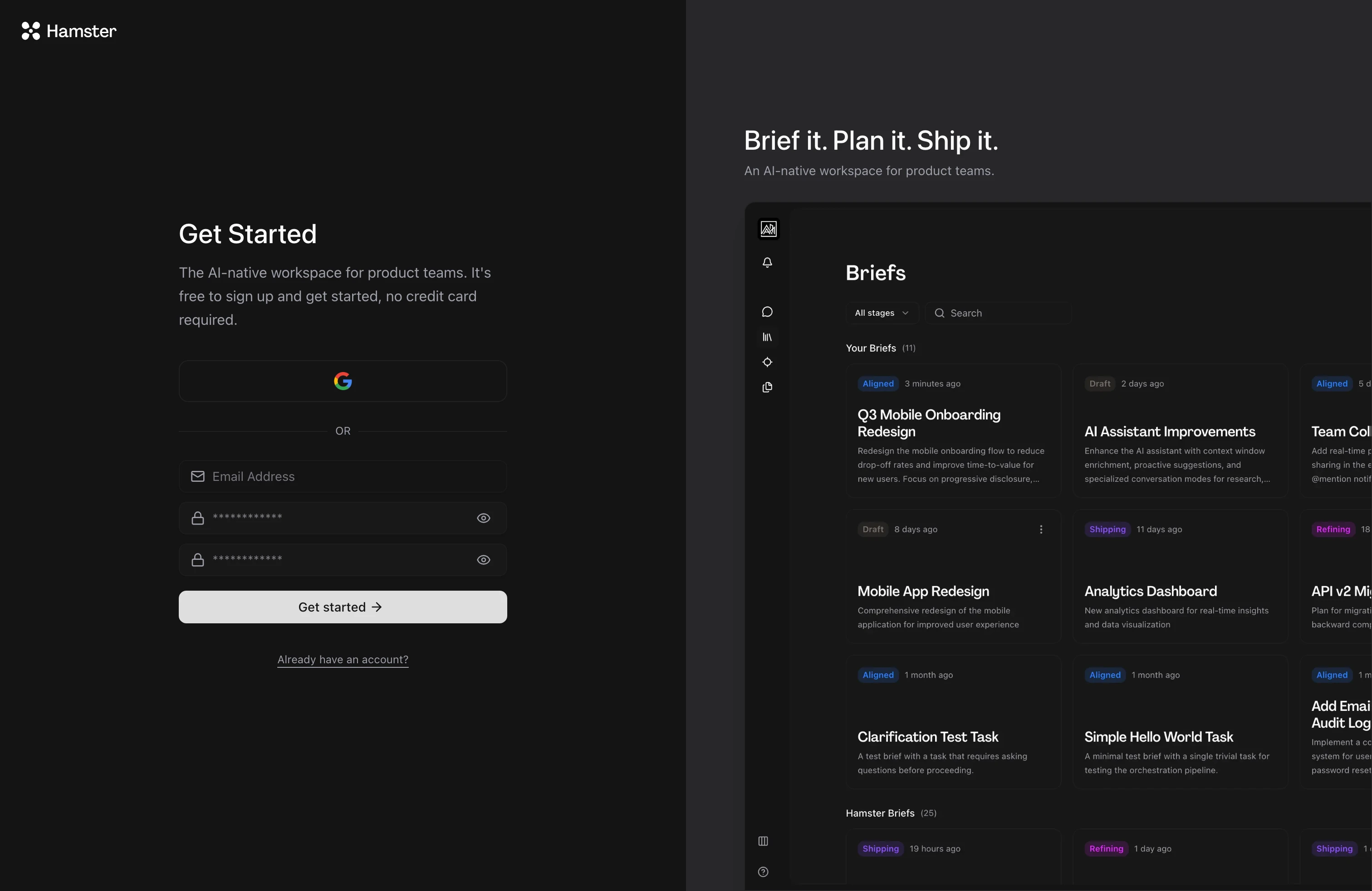 Creating an account gives you access to your Hamster Studio workspace, where you can start conversations, create briefs, and collaborate with your team. You can sign up directly or join via a team invitation link.