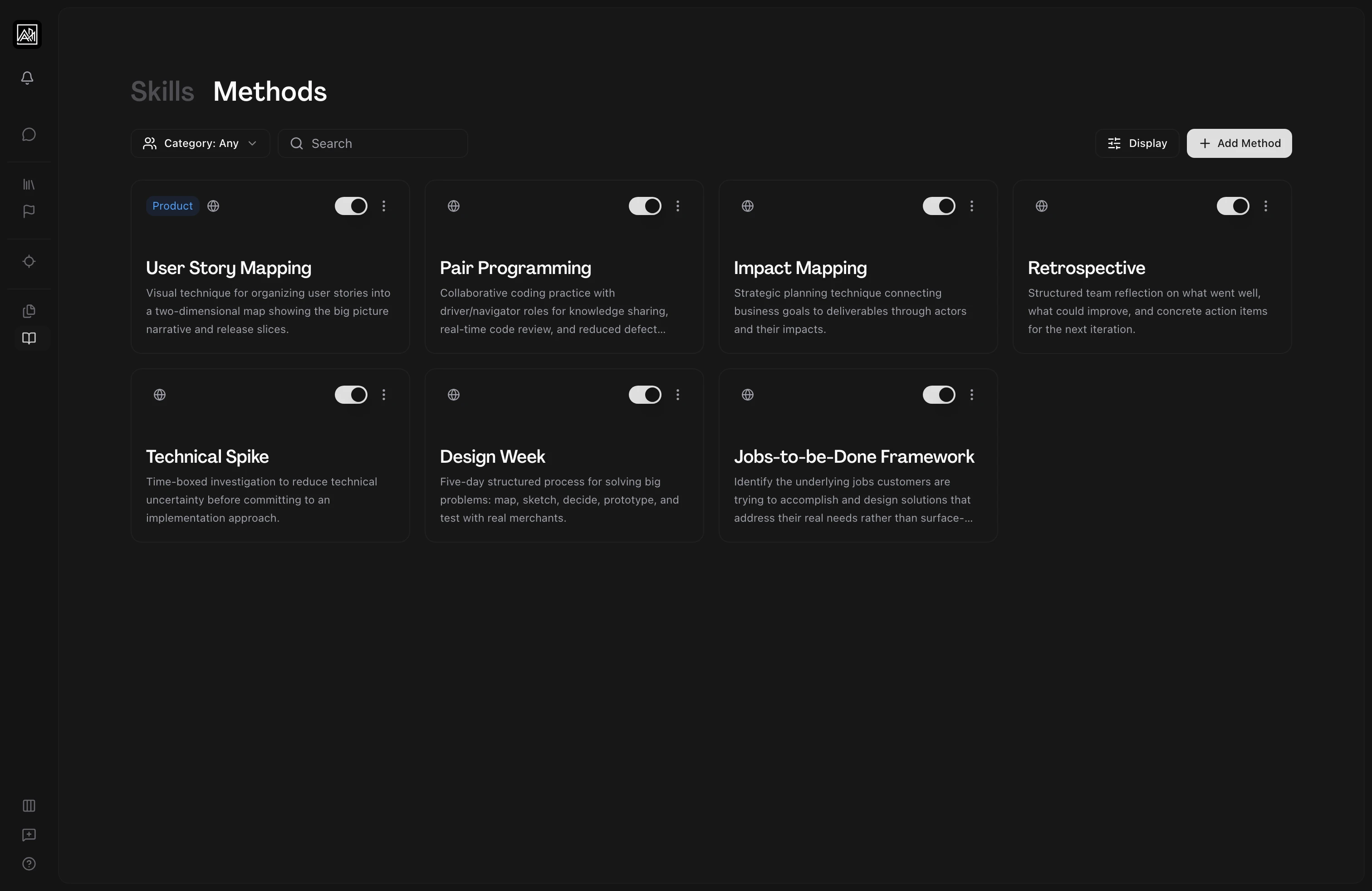 Category labels: Methods use the same six categories as Skills — Product, Ops, Experience, Development, Marketing, and Workflows.