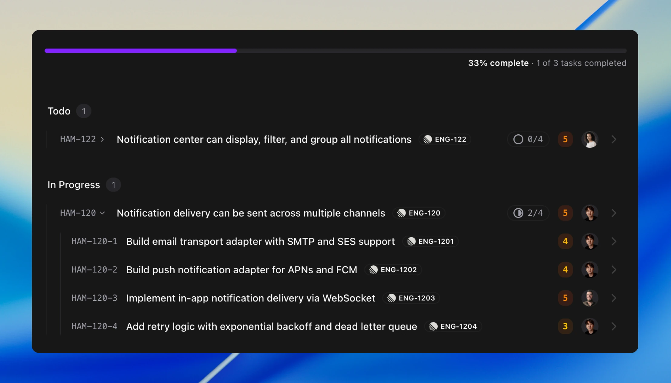 Tasks created from your plan link directly to Linear issues. Move a task in either tool and the other updates.