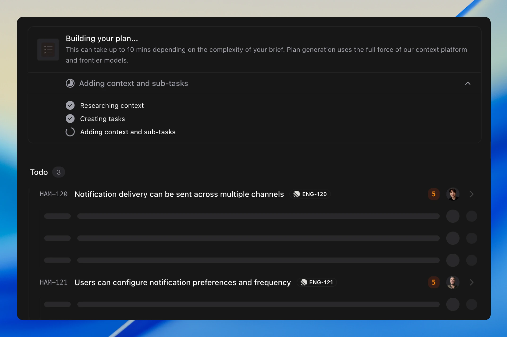 Plan generation used to be a black box. Now you can watch it happen: each phase is tracked, and tasks stream into the list as they're created.
