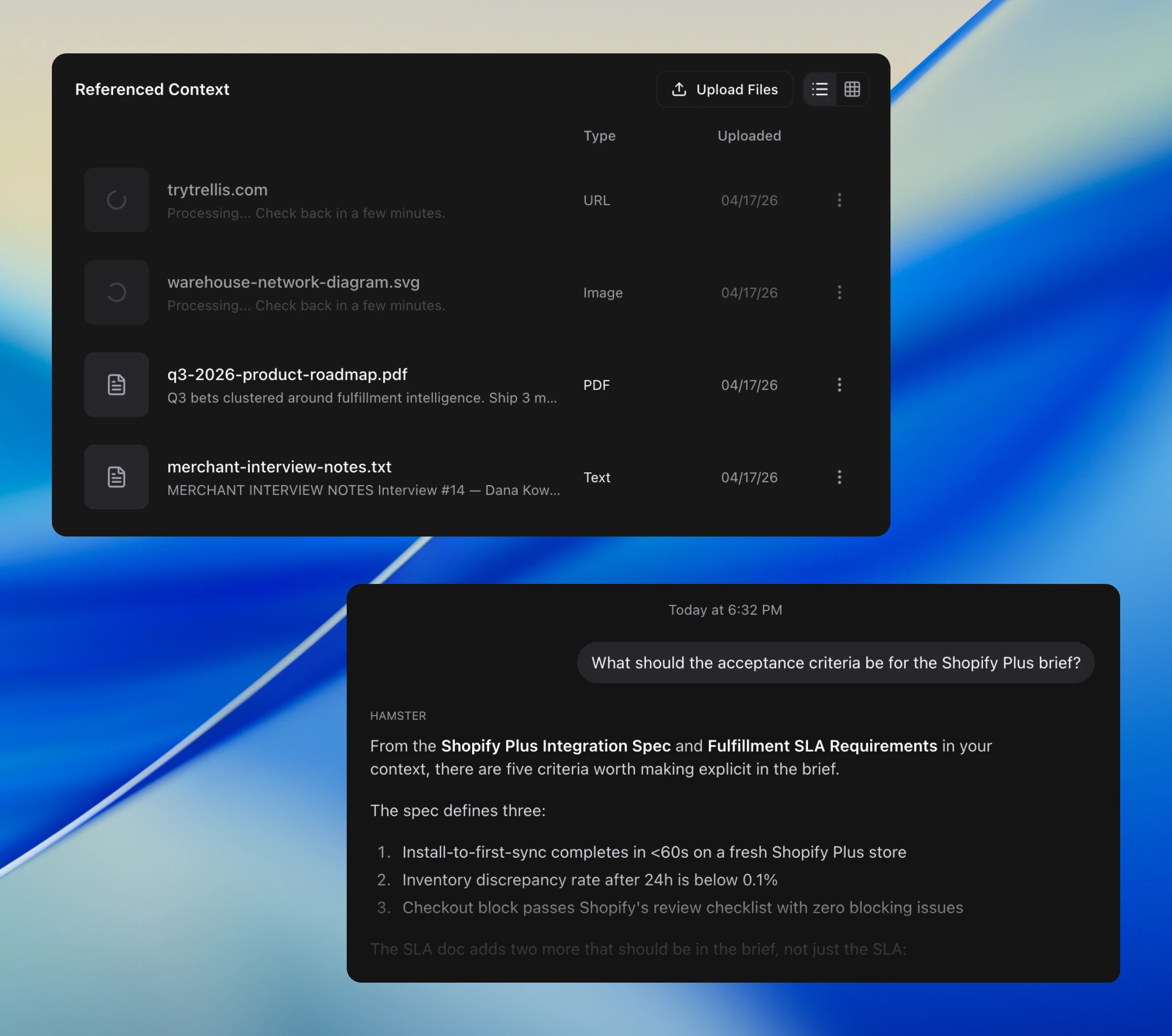 Hamster cites the specific passage from an uploaded file when that file answers the question.